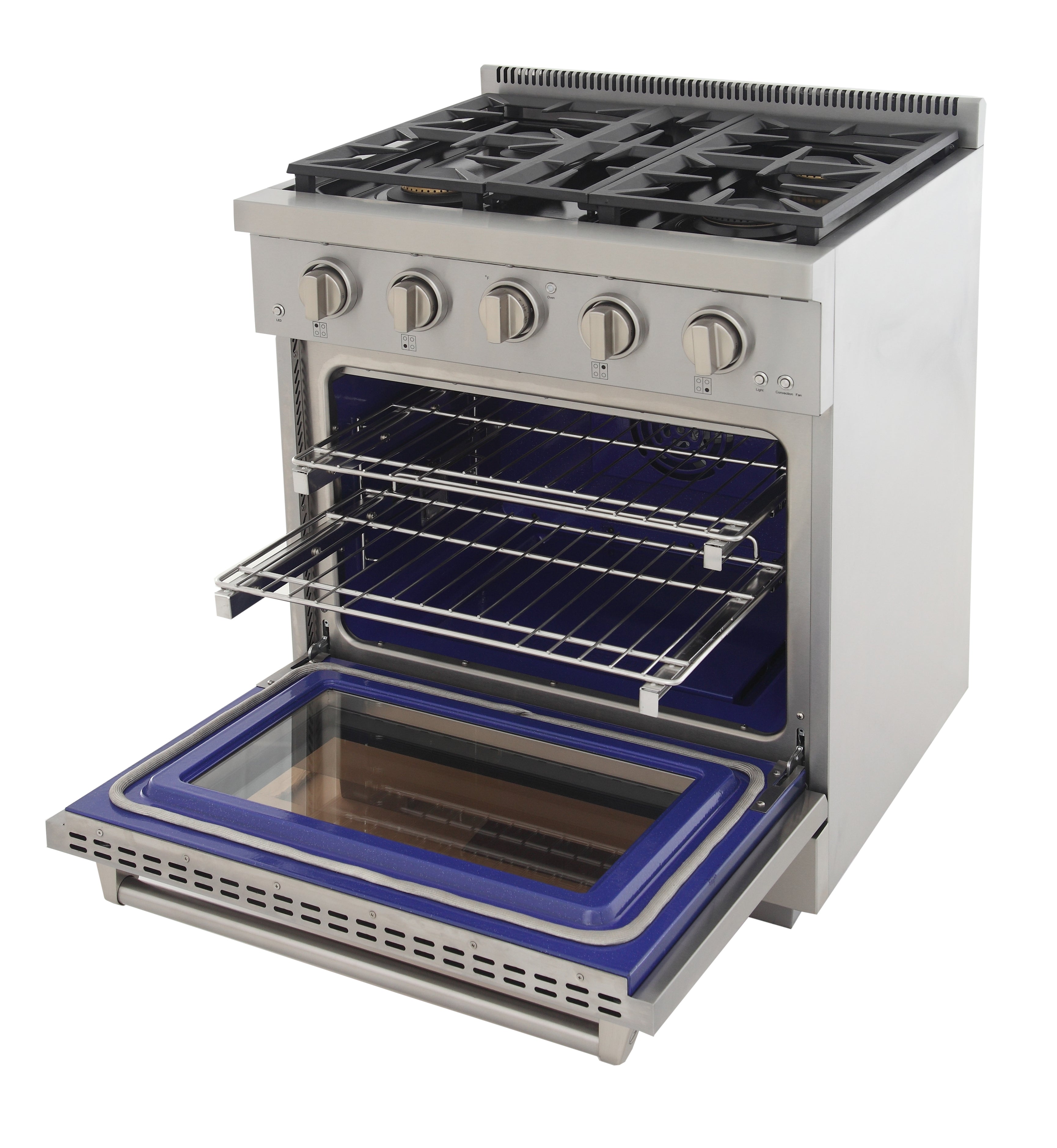 This pro-style range delivers 4 high-performance sealed burners (including a 21,000 BTU Rocket Power burner) and a spacious 4.2 cu. ft. convection oven with dual halogen lighting. Heavy-duty cast-iron grates, full stainless steel construction, and premium metal control knobs ensure durability and elegance.