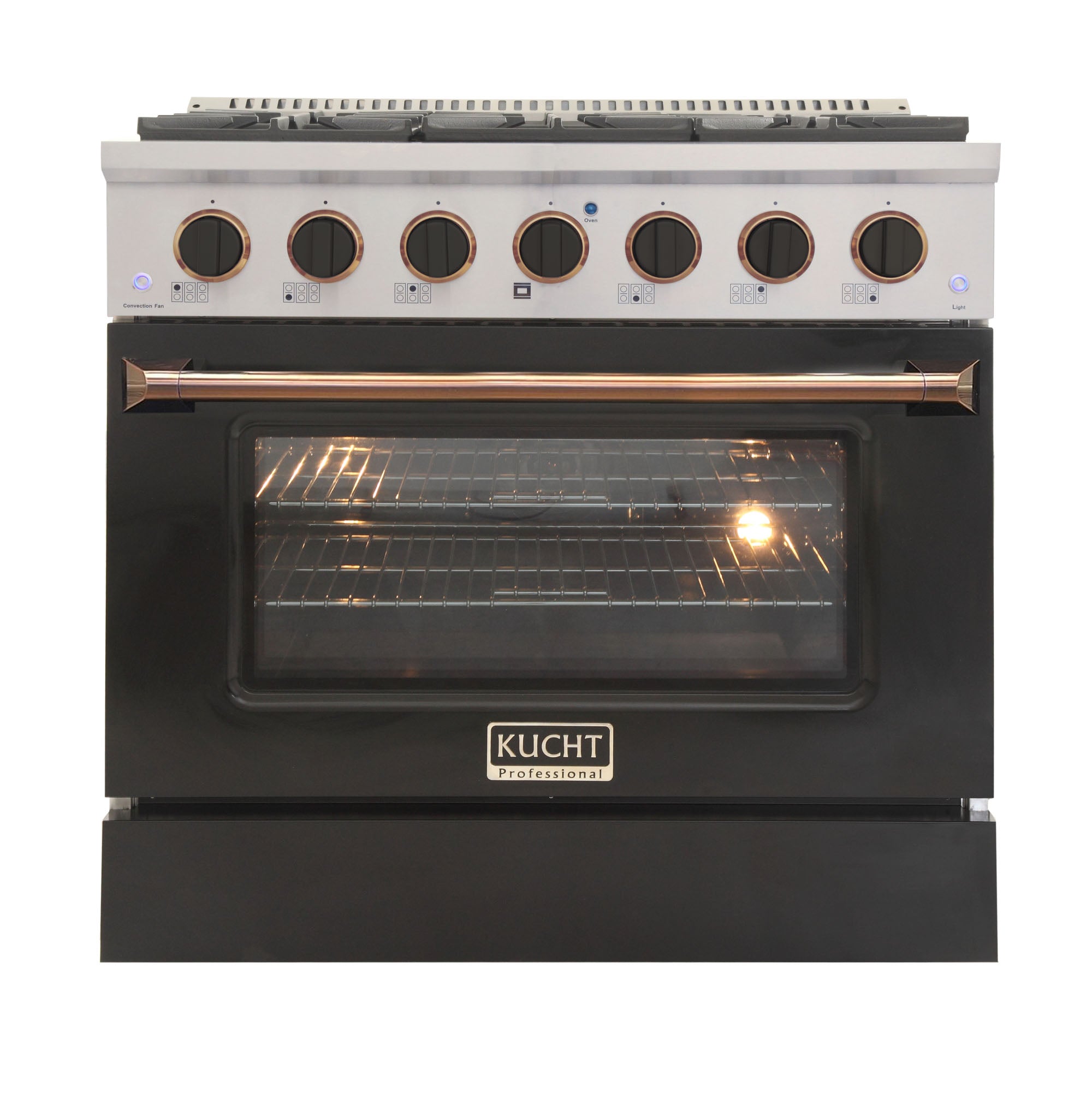 Command the kitchen with the Kucht Professional 36" Dual Fuel Range (KDF362/LP-K Customized) — Matte Black body paired with premium Gold or Rose Gold accent knobs and factory-configured for Propane (LP). Swap the oven door and kickplate with affordable color sets (sold separately) to refresh your style in under 2 minutes.