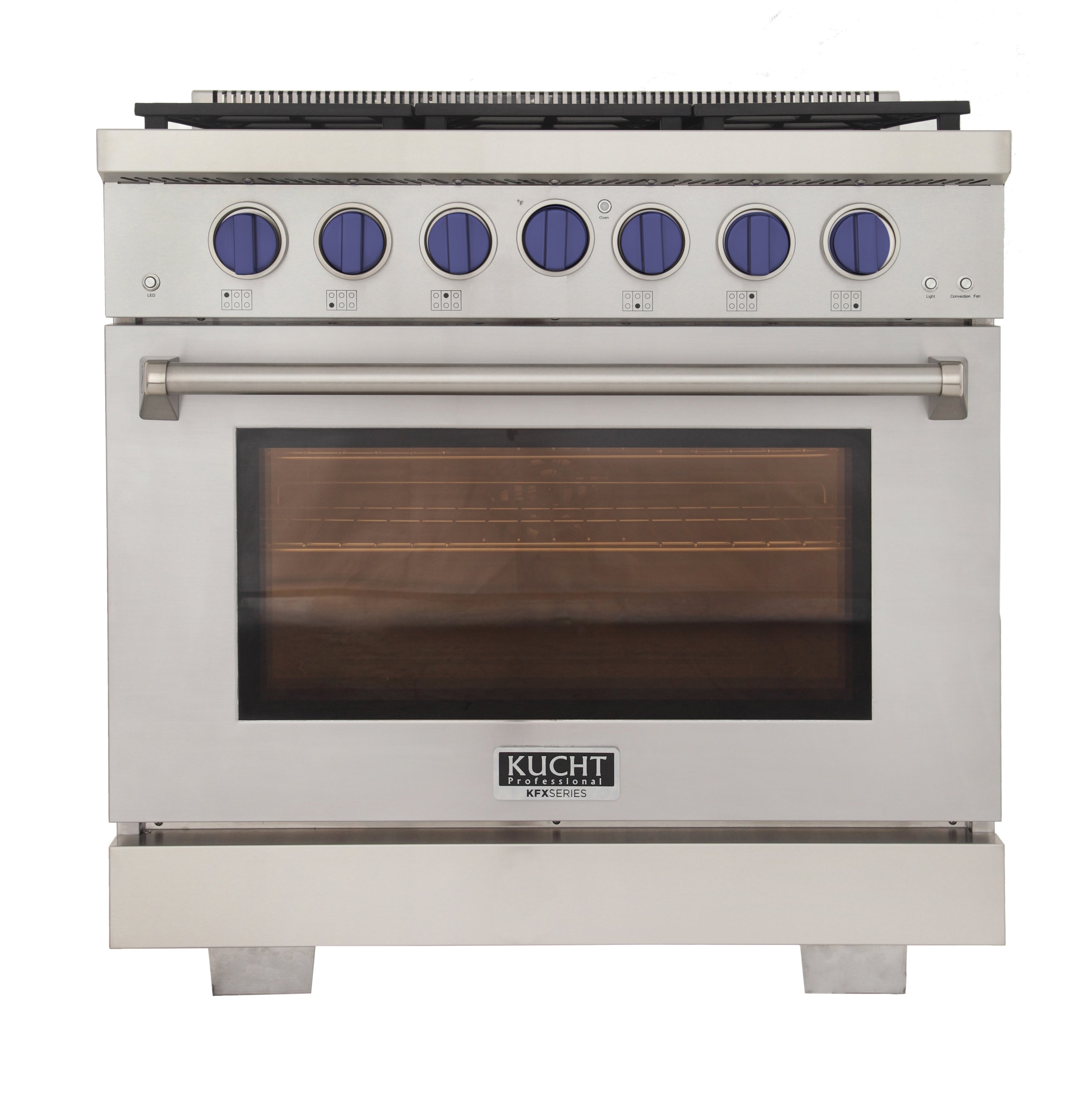 Rule the kitchen with the Kucht Professional 36" Freestanding Gas Range (KFX360 Series) – full gas cooktop + powerful gas convection oven. Choose from 6 bold body colors and pair with Stainless Steel, Tuxedo Black, or Royal Blue premium accent knobs for a stunning custom look.