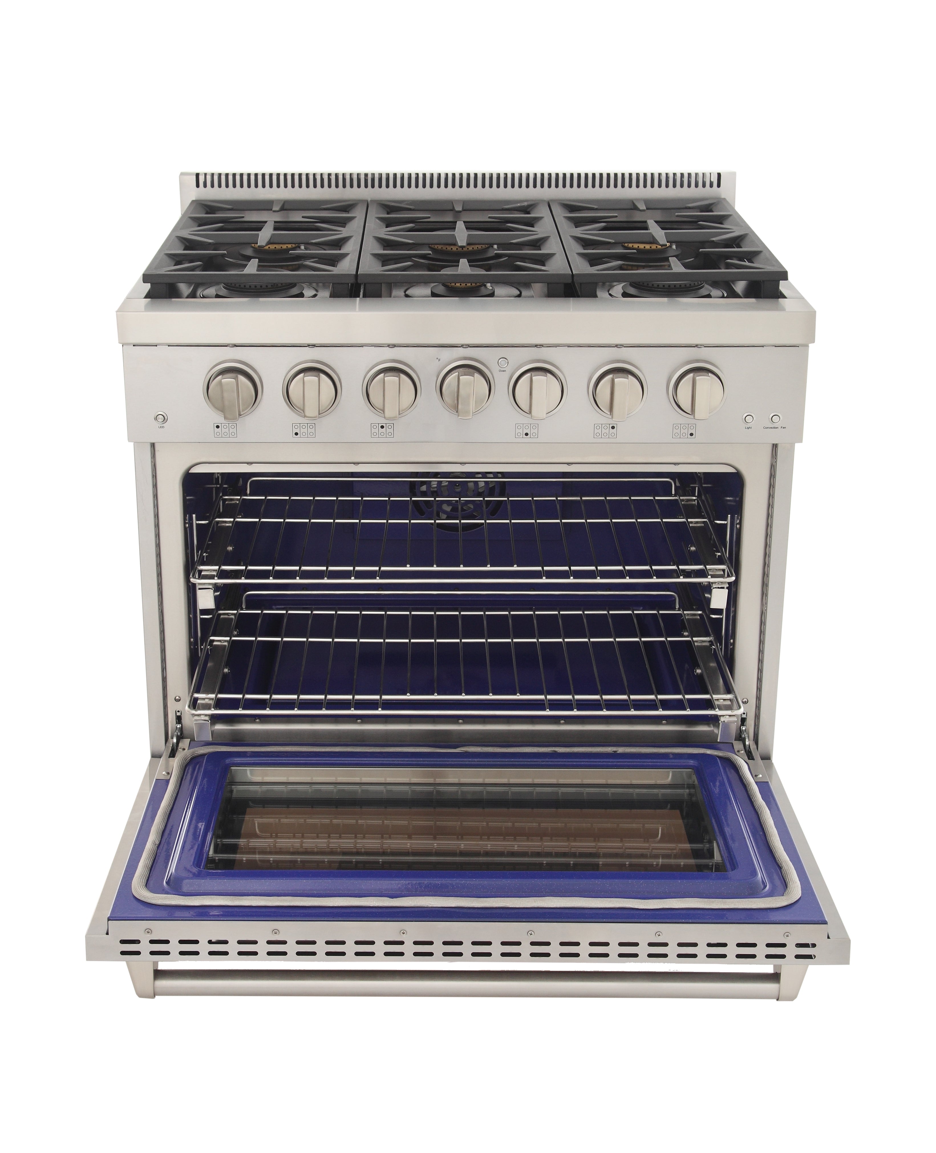 6 sealed high-performance burners including 2 × 21,000 BTU Rocket Power Burners, 1 × 15,000 BTU, 2 × 12,000 BTU, and 1 × 9,000 BTU true simmer. The massive 5.2 cu. ft. convection oven delivers 22,000 BTU convection bake + 16,500 BTU infrared broiler, fine blue porcelain interior, telescopic stainless racks, and halogen lighting. Includes reversible cast-iron grill/griddle, continuous heavy-duty cast-iron grates, professional handle, sealed burners, and electronic ignition with auto re-ignition. LP conversion kit included free. Backed by a 2-year parts & labor warranty.