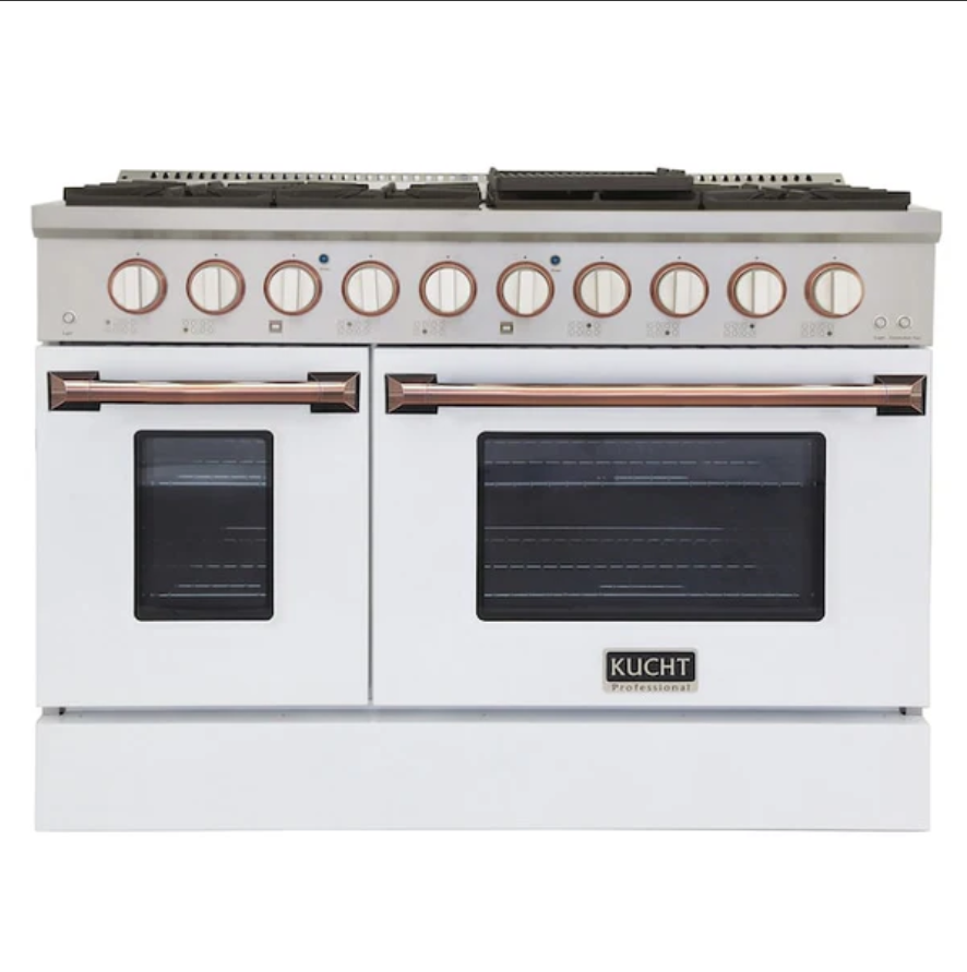 Transform your kitchen into a masterpiece of elegance and performance with the Kucht Professional 48" LP Gas Range in pristine White. Designed for those who demand luxury without compromise, this pro-style range combines a clean, sophisticated white finish with customizable metallic accents in Gold or Rose Gold for a truly personalized statement.